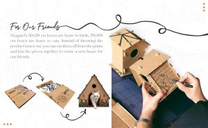 We give priority to quality and meaningful design. For this reason, Hoagard’s 50×50 cm boxes are home to birds, 70×100 cm boxes are home to cats. Instead of throwing the product boxes out, you can cut them off from the prints and join the pieces together to create a new house for our friends.